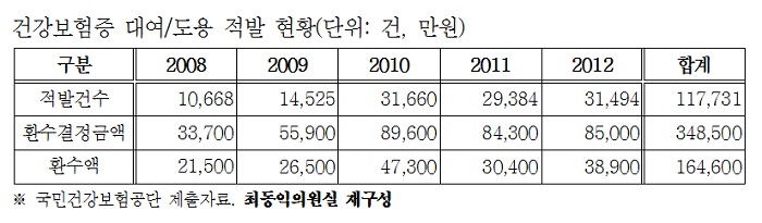 Áö³ 5³â°£ ŸÀÎÀÇ °Ç°º¸ÇèÁõÀ» ºÒ¹ý´ë¿© ¹× µµ¿ëÇØ¼ °Ç°º¸Çè ÇýÅÃÀ» ¹Þ¾Æ Àû¹ßµÈ °Ç¼ö´Â 11¸¸ °ÇÀ̳ª µÇ´Â °ÍÀ¸·Î Á¶»çµÆ´Ù.