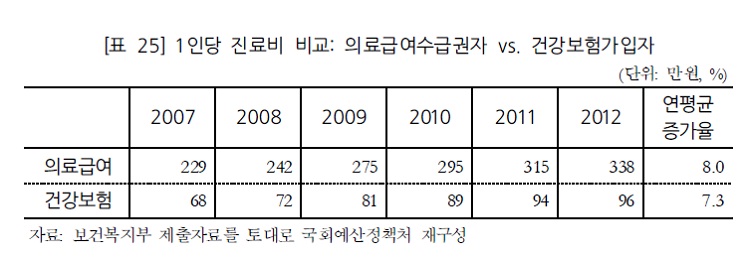 ÀÇ·á±Þ¿©¼ö±Þ±ÇÀÚ¿Í °Ç°º¸Çè°¡ÀÔÀÚÀÇ 1Àδç ÃÑ Áø·áºñ¸¦ »ìÆìº¸¸é, 2012³â ±âÁØ ÀÇ·á±Þ¿©¼ö±Þ±ÇÀÚ´Â ¿¬ 338¸¸¿øÀ̰í, °Ç°º¸Çè°¡ÀÔÀÚ´Â ¿¬ 96¸¸¿øÀ¸·Î ÀÇ·á±Þ¿©¼ö±Þ±ÇÀÚ°¡ 3¹è ÀÌ»óÀÇ Áø·áºñ¸¦ »ç¿ëÇϰí ÀÖ´Â °ÍÀ¸·Î ³ªÅ¸³µ´Ù.