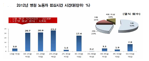 ƯÈ÷ º´¿ø Á¾»çÀÚµéÀÌ ÀÏÁÖÀÏ¿¡ ³¢´Ï¸¦ °Å¸£´Â Æò±Õ Ƚ¼ö´Â 1.9ȸ·Î ÀüüÀÇ Àý¹Ý ÀÌ»óÀÎ 53%°¡ ÀÏÁÖÀÏ¿¡ ÇÑ ¹ø ÀÌ»ó Á¡½É½Ä»ç¸¦ °Å¸£´Â °ÍÀ¸·Î ³ªÅ¸³µ´Ù.