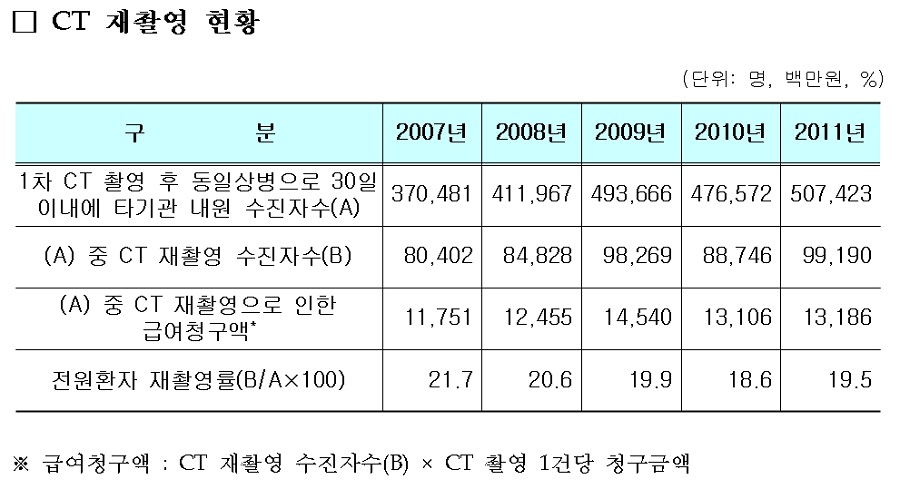 1Â÷ CT ÃÔ¿µ ÈÄ °°Àº Áúº´À¸·Î ÇÑ ´Þ ³»¿¡ ´Ù¸¥ ÀÇ·á±â°ü¿¡¼ CT¸¦ ÀçÃÔ¿µÇÑ È¯ÀÚ´Â 2007³â 8¸¸402¸í, 2008³â 8¸¸4828¸í, 2009³â 9¸¸8269¸í, 2010³â 8¸¸8746¸í, 2011³â 9¸¸9190¸í µîÀ¸·Î Áö¼ÓÀûÀ¸·Î Áõ°¡Çß´Ù.