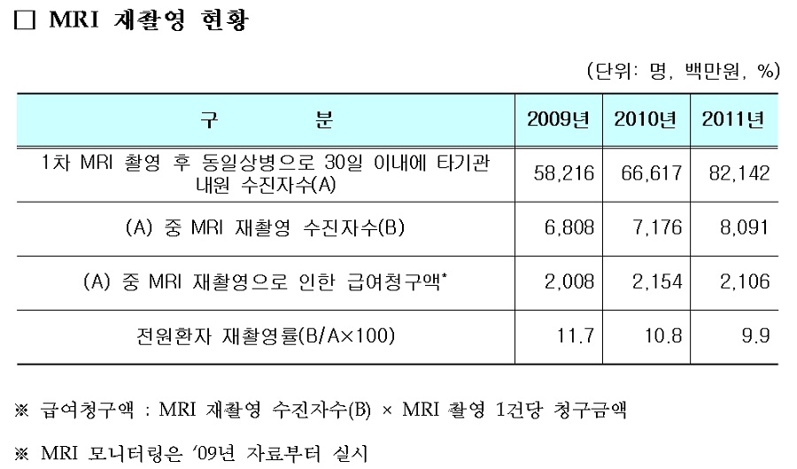 MRI ÃÔ¿µ ÈÄ ÇÑ ´Þ ³» ´Ù¸¥ ÀÇ·á±â°ü¿¡¼ ÀçÃÔ¿µÇÑ »ç¶÷Àº 2011³â 8¸¸2142¸íÀ¸·Î ÀÌÁß 10%¿¡ °¡±î¿î 8091¸íÀÌ MRI¸¦ ÀçÃÔ¿µÇß´Ù.[Ç¥]