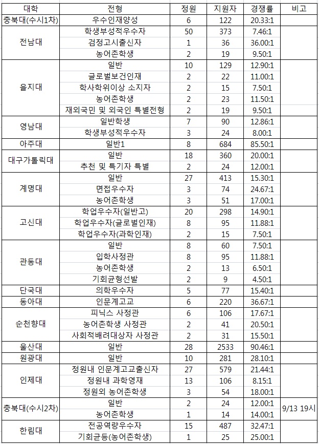 ÀÌ ¹Û¿¡µµ À»Áö´ë ÀÇ¿¹°ú ÀϹÝÀüÇü 12.90:1, ¿µ³²´ë ÀÇ¿¹°ú ÀϹÝÇлý ÀüÇü 12.86:1, ´ë±¸°¡Å縯´ë ÀÇ¿¹°ú ÀϹÝÀüÇü 20.00:1, °í½Å´ë ÀÇ¿¹°ú Çо÷¿ì¼öÀÚ(ÀϹݰí) ÀüÇü 14.90:1, °üµ¿´ë ÀÇÇаú ÀϹÝÀüÇü 7.50:1, ´Ü±¹´ë ÀÇÇпì¼öÀÚ ÀüÇü 15.40:1 µîÀ¸·Î Áý°èµÆ´Ù.