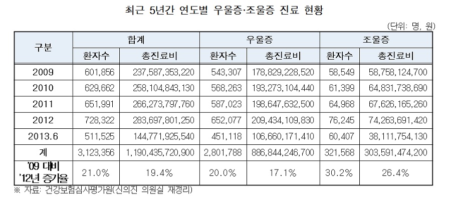 ±¹È¸ º¸°Çº¹ÁöÀ§¿øÈ¸¿¡¼ Ȱµ¿ ÁßÀÎ »õ´©¸®´ç ½ÅÀÇÁø ÀÇ¿øÀÌ °Ç°º¸Çè½É»çÆò°¡¿øÀ¸·ÎºÎÅÍ Á¦Ãâ¹ÞÀº ¡®¿ì¿ïÁõ¡¤Á¶¿ïÁõ Áø·áÇöȲ¡¯À» ºÐ¼®ÇÑ °á°ú, ÃÖ±Ù 5³â°£(2009~2013.6¿ù) ¿ì¿ïÁõ¡¤Á¶¿ïÁõÀ¸·Î º´¿øÀ» ãÀº ȯÀÚ ¼ö´Â 312¸¸¸íÀ̰í, Áø·áºñ´Â 1Á¶1904¾ï¿øÀ¸·Î ³ªÅ¸³µ´Ù.[Ç¥]