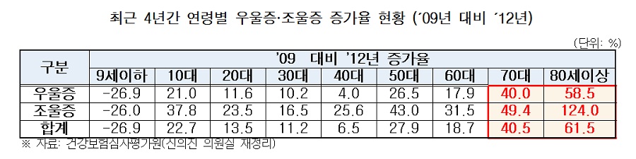 ƯÈ÷, ÃÖ±Ù 4³â°£ Áõ°¡À²(2009³â ´ëºñ 2012³â)À» ¿¬·Éº°·Î »ìÆìº¸¸é, 80¼¼ ÀÌ»óÀÌ 61.5% ±ÞÁõÇØ Áõ°¡À²ÀÌ °¡Àå ³ô¾Ò°í, ±× µÚ 70´ë°¡ 40.5%·Î ³ªÅ¸³ª ±× ½É°¢¼ºÀ» ´õÇß´Ù.[Ç¥]