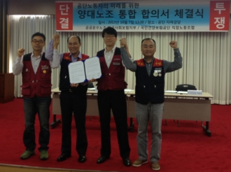±¹¹Î°Ç°º¸Çè°ø´Ü ¾ç´ë³ëÁ¶ÀÎ ¹ÎÁÖ³ëÃÑ Àü±¹»çȸº¸ÇèÁöºÎ¿Í Çѱ¹³ëÃÑ ±¹¹Î°Ç°º¸Çè°ø´ÜÁ÷Àå³ëÁ¶´Â 7ÀÏ ¿ÀÈÄ 1½Ã 30ºÐ ³ëÁ¶ ÅëÇÕ¿¡ °üÇÑ ÇÕÀǼ¸¦ ü°áÇß´Ù.