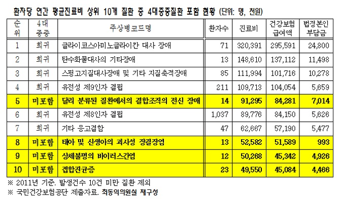 ƯÈ÷ ȯÀÚ ´ç ¿¬°£ Æò±ÕÁø·áºñ°¡ °¡Àå ¸¹ÀÌ ¼Ò¿äµÇ´Â Ãʰí¾×Ä¡·á 10°³ Áúȯ Áß 4°³ Áúȯµµ 4´ë ÁßÁõÁúȯ¿¡ Æ÷ÇÔµÇÁö ¾Ê´Â °ÍÀ¸·Î ³ªÅ¸³µ´Ù.[Ç¥]