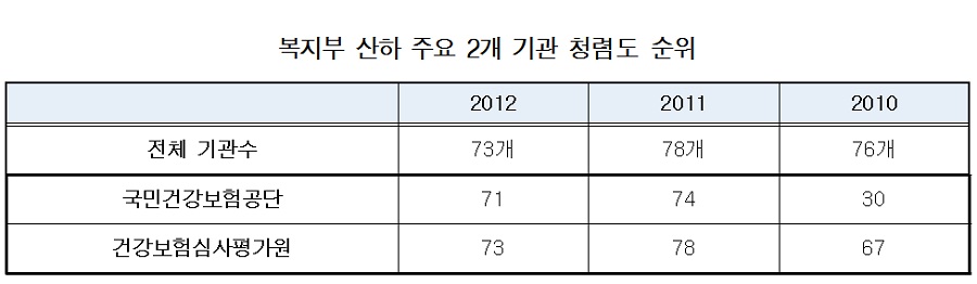 ¹®Á¦´Â ÀÌ µÎ ±â°üÀÇ Ã»·Åµµ°¡ ¸Å³â Ç϶ôÇϰí ÀÖ´Â °ÍÀÌ´Ù. ±¹¹Î°Ç°º¸Çè°ø´ÜÀÇ Á¾ÇÕû·Åµµ´Â 2010³â 8.77Á¡¿¡¼ 2012³â 8.43Á¡À» ±â·ÏÇß´Ù.