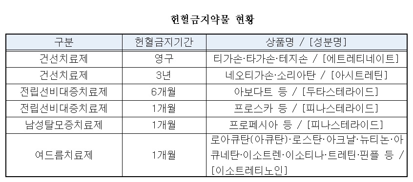 ÇöÀç ´ëÇÑÀû½ÊÀÚ»ç´Â ÀÓ»êºÎ¿¡°Ô ¼öÇ÷ ½Ã ±âÇüÀ» À¯¹ßÇÒ ¼ö ÀÖ´Â ¾à¹°À» ÇåÇ÷±ÝÁö¾à¹°·Î ÁöÁ¤ÇØ ÀÏÁ¤±â°£ ÇåÇ÷À» ±ÝÁö½Ã۰í ÀÖ´Ù.[Ç¥]