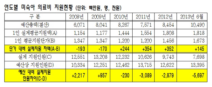 Á¤ºÎ´Â 2012³â ¿¹»ê Ã¥Á¤ ½Ã ¹Ì¼÷¾Æ 1Àδç ÀÇ·áºñ Áö¿ø´Ü°¡¸¦ 145¸¸¿øÀ¸·Î Ãß°èÇß´Ù. ±×·¯³ª ½ÇÁ¦ 1ÀÎ´ç Æò±ÕÁö¿ø¾×Àº 180¸¸¿øÀ¸·Î Áö¿ø´Ü°¡¿¡ ºñÇØ 35¸¸¿øÀ̳ª ³ôÀº °ÍÀ¸·Î ³ªÅ¸³µ´Ù.