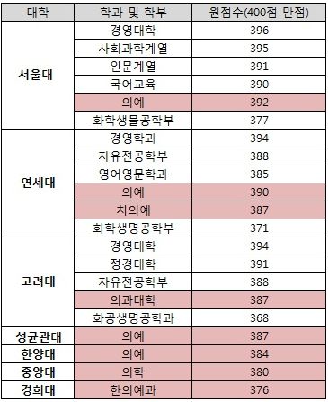 À̿ܿ¡ ¼º±Õ°ü´ë ÀÇ¿¹°ú´Â °í·Á´ë Àǰú´ëÇаú µ¿ÀÏÇÑ 387Á¡, ÇѾç´ë ÀÇ¿¹°ú 384Á¡, Áß¾Ó´ë ÀÇÇкΠ380Á¡, °æÈñ´ë ÇÑÀÇ¿¹°ú 376Á¡ µîÀ¸·Î Àü¸ÁµÆ´Ù.[Ç¥]
