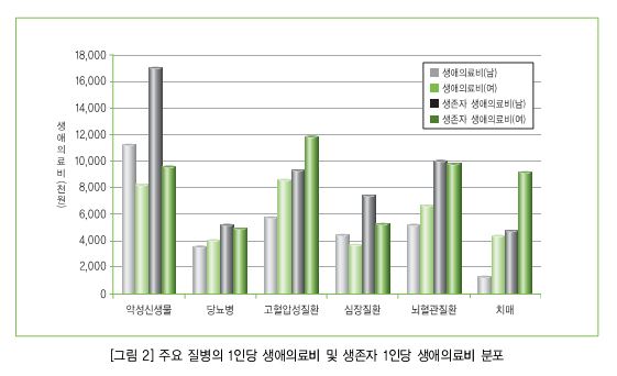 ¾Ç¼º½Å»ý¹°, ´ç´¢º´, °íÇ÷¾Ð¼ºÁúȯ, ½ÉÀåÁúȯ, ³úÇ÷°üÁúȯ, Ä¡¸Å µî 6°³ Áúº´À» Áß½ÉÀ¸·Î »ìÆìºÃÀ» ¶§´Â ³²ÀÚ´Â ¾Ç¼º½Å»ý¹°, ¿©ÀÚ´Â °íÇ÷¾Ð¼º ÁúȯÀÇ 1ÀÎ´ç »ý¾ÖÀÇ·áºñ°¡ °¡Àå ¸¹¾Ò´Ù.