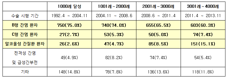 ÀÌ °°Àº ¼ö¼úÀ» ¼¿ï¾Æ»êº´¿øÀº 2007³âºÎÅÍ 7³â ¿¬¼Ó ¿¬ 300·Ê ½ÃÇàÇϰí ÀÖÀ¸¸ç, ÀÌ Áß »ýü °£À̽ÄÀÌ 3385°Ç, 2´ë1 °£ÀÌ½Ä 230°Ç, ABO Ç÷¾×Çü ºÎÀûÇÕ °£ÀÌ½Ä 230°ÇÀº ¼¼°è¿¡¼ °¡Àå ¸¹ÀÌ ½ÃÇàÇϰí ÀÖ´Â °ÍÀ¸·Î ³ªÅ¸³µ´Ù.