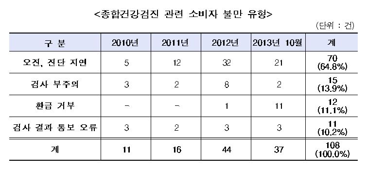 ¶Ç Áö³ 2010³â 1¿ùºÎÅÍ ¿Ã 10¿ù±îÁö Á¢¼öµÈ ÇÇÇØ±¸Á¦ 108°ÇÀ» ºÐ¼®ÇÑ °á°ú¿¡ ÀÇÇϸé '¿ÀÁø¡¤Áø´ÜÁö¿¬' °ü·Ã ÇÇÇØ°¡ 70°Ç(64.8%)·Î °¡Àå ¸¹¾Ò°í, ±× ¹Û¿¡ '°Ë»çºÎÁÖÀÇ' 15°Ç(13.9%), 'ȯ±Þ °ÅºÎ' 12°Ç(11.1%), '°Ë»ç °á°ú Å뺸 ¿À·ù' 11°Ç(10.2%) ¼øÀ¸·Î ³ªÅ¸³µ´Ù.