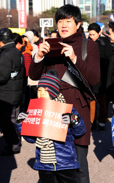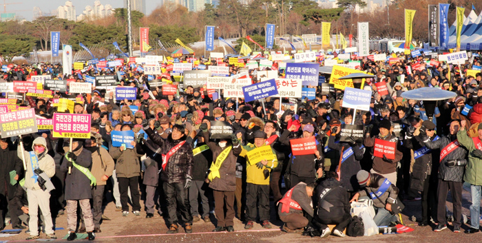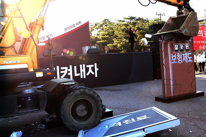 ¡ãÄ® ²¨³» ÀÚ½ÅÀÇ ¸ñ¿¡ µéÀÌ ´í ³ëȯ±Ô ȸÀå. ³ëȸÀåÀº "Á¤ºÎ°¡ Çѱ¹ÀÇ·á¿¡ ÀÌ·¸°Ô Ä®À» °Ü´©°í ÀÖ´Ù"°í ÇÇ·ÂÇß´Ù. |