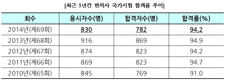 Á¦69ȸ ÇÑÀÇ»ç ±¹°¡½ÃÇèÀÇ ÇÕ°Ý·üÀº 94.2%·Î ÃÑ 830¸í ÀÀ½ÃÀÚ Áß 782¸íÀÌ ÇÕ°ÝÇß´Ù. À̹ø ÇÕ°Ý·üÀº Áö³ÇØ(94.9%)¿Í °ÅÀÇ ºñ½ÁÇÑ ¼öÁØÀÌ´Ù. ÇÑÀǻ籹½Ã ¼ö¼®ÇÕ°ÝÀÚ´Â µ¿±¹´ë ÇÑ¿¹Áö¾¾·Î 420Á¡ ¸¸Á¡¿¡ 394Á¡(93.8Á¡/100Á¡ ȯ»ê ±âÁØ)À» ¹Þ¾Ò´Ù.