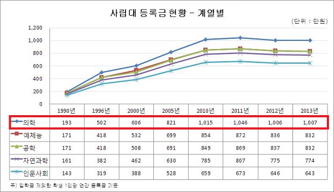 ´ëÇб³À°¿¬±¸¼Ò ÃøÀº ¡°2013³â ÇöÀç ´ëÇÐ µî·Ï±ÝÀº ÀÇÇÐ°è¿ 1000¸¸¿ø µî Àü °è¿¿¡¼ 1990³â ´ëºñ ¾à 5¹è ÀÎ»óµÆ´Ù¡±¸é¼ ¡°°è¿°£ Â÷À̵µ Àι®»çȸ°è¿(100%) ±âÁØÀ¸·Î ÀÚ¿¬°úÇÐ°è¿ 120%, °øÇС¤¿¹Ã¼´É°è¿ 129%, ÀÇÇÐ°è¿ 157%·Î 1990³â º¸´Ù Å©°Ô ¹ú¾îÁ³´Ù¡±°í ºÐ¼®Çß´Ù.