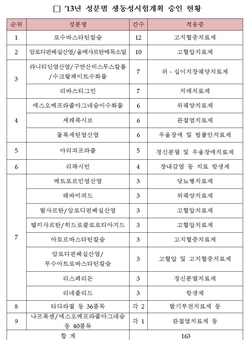 ½ÄǰÀǾàǰ¾ÈÀüó°¡ 7ÀÏ ¹ßÇ¥ÇÑ ¡®2013³âµµ Á¦³×¸¯ ÀǾàǰ °³¹ßµ¿Ç⠺м®¡¯ ÇöȲ¿¡ µû¸£¸é °íÁöÇ÷Áõ¾à ·Î¼ö¹Ù½ºÅ¸Æ¾ 12°Ç, °íÇ÷¾Ð¾à ¾Ï·ÎµðÇÉ/¿Ã¸Þ»ç¸£Åº 10°Ç, À§½ÊÀÌÁöÀå±Ë¾ç¾à ¶ó´ÏƼµò/±¸¿¬»êºñ½º¹«½ºÄ®·ý/¼öÅ©¶öÆäÀÌÆ®¼öȹ° 7°Ç, Ä¡¸Å¾à ¸®¹Ù½ºÆ¼±×¹Î 7°Ç ¼øÀ̾ú´Ù.