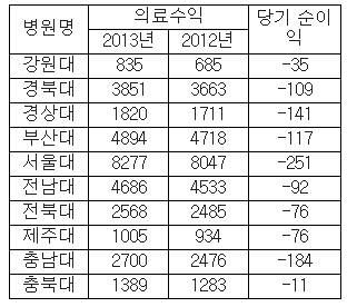 ´ÙÀ½À¸·Î ÀÇ·á¼öÀÍÀÇ ÀûÀÚÆøÀÌ Å« ±¹¸³´ëº´¿øÀº Ãæ³²´ëº´¿øÀ¸·Î -184¾ï¿ø ¡ã°æ»ó´ë -141¾ï¿ø ¡ãºÎ»ê´ë -117¾ï¿ø ¡ã°æºÏ´ë -109¾ï¿ø ¡ãÀü³²´ë -92¾ï¿ø ¡ãÀüºÏ´ë -76¾ï¿ø ¡ãÁ¦ÁÖ´ë -76¾ï¿ø ¡ã°¿ø´ë -35¾ï¿ø ¡ãÃæºÏ´ë -11¾ï¿ø ¼øÀÌ´Ù.