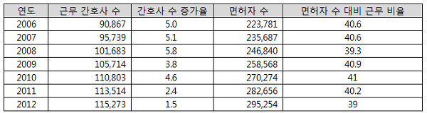 ÀÌ´Â ¸éÇãÀÚ ¼ö ´ëºñ ÀÇ·á±â°ü ±Ù¹« °£È£»ç ºñÀ² ¿ª½Ã 2010³â 41%¿¡¼ 2011³â 40.2%, 2012³â 39%·Î Ç϶ôÇÑ °ÍÀÌ´Ù.[¾Æ·¡ Ç¥]