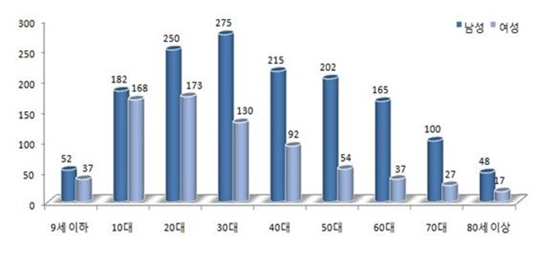 ¹ßº´·üÀÌ °¡Àå ³ôÀº ¿¬·É´ë´Â Àüü Áø·áÀοøÀÇ 22.6%¸¦ Â÷ÁöÇÑ 30´ë¿´´Ù. Áø·áÀοøÀº 1¸¸6537¸í ¿´´Ù. À̾î 20´ë 1¸¸4241¸í(19.5%), 40´ë 1¸¸3525¸í(18.5%)À¸·Î º¸°íµÆ´Ù. Áï Áø·áÀοøÀÇ 60.6%°¡ 20~40´ë ¿´´Ù.