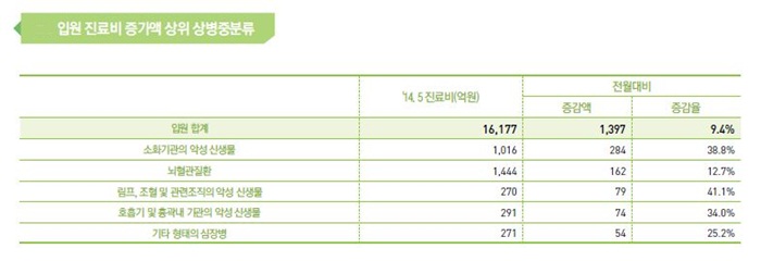 ƯÈ÷ ¼Òȱâ°üÀÇ ¾Ç¼º½Å»ý¹° Áõ°¡¼¼°¡ µÎµå·¯Á³´Ù. ¼Òȱâ¾Ï Áø·áºñ´Â ÃÑ 1016¾ï¿øÀ¸·Î Àü¿ù ´ëºñ 38.8%(284¾ï¿ø) Áõ°¡Çß´Ù. µÚ¸¦ ÀÌ¾î ³úÇ÷°üÁúȯÀ¸·Î ¼Ò¿äµÈ Áø·áºñ´Â ÃÑ 1444¾ï¿øÀ¸·Î Àü¿ø´ëºñ ¾à 162¾ï¿ø(12.7%)ÀÌ ´õ ¾²¿´´Ù.
