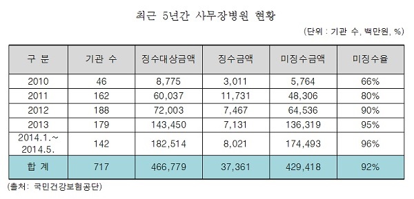 ÃÖ±Ù 5³â°£ »ç¹«À庴¿ø ÃÑ Àû¹ß °Ç¼ö´Â 717°Ç, ¡¼ö ±Ý¾×Àº ¾à 4668¾ï ¿øÀ¸·Î ¸Å³â ±Ô¸ð°¡ Å©°Ô Áõ°¡Çϰí ÀÖ´Ù.[Ç¥]