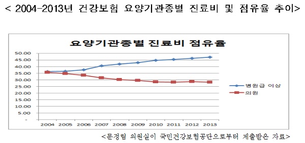 »õ´©¸®´ç ¹®Á¤¸² ÀÇ¿ø(º¸°Çº¹ÁöÀ§¿øÈ¸ ¼Ò¼Ó)ÀÌ ±¹¹Î°Ç°º¸Çè°ø´ÜÀ¸·ÎºÎÅÍ Á¦Ãâ¹ÞÀº ¡®¿ä¾ç±â°ü Á¾º° Áø·áºñ Á¡À¯À² ¹× ÀÔ¿ø¡¤¿Ü·¡ ȯÀÚ Áø·áºñ ÇöȲ¡¯ ÀڷḦ ºÐ¼®ÇÑ °á°ú ÀÇ¿ø±Þ ÀÇ·á±â°üÀÇ Áø·áºñ Á¡À¯À²Àº 2004³â 35.6%¿¡¼ 2013³â 28.3%·Î Å« ÆøÀ¸·Î ÁÙ¾ú´Ù.
