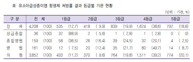 ±× °á°ú 36°³ »ó±ÞÁ¾º´ Áß 32°³(88.9%) ±â°üÀÌ Ç×»ýÁ¦¸¦ 65% ¹Ì¸¸À¸·Î »ç¿ëÇÏ´Â 1µî±Þ ±â°üÀ¸·Î ¼±Á¤µÆ´Ù. 4µî±ÞÀ» ¹ÞÀº °¡Å縯´ëÇб³ ¼¿ï¼º¸ðº´¿øÀÌ 88.7%·Î Àüü Ç×»ýÁ¦ 󹿷ü Æò±Õ 82.1%¸¦ 6.6% ÃʰúÇß´Ù.