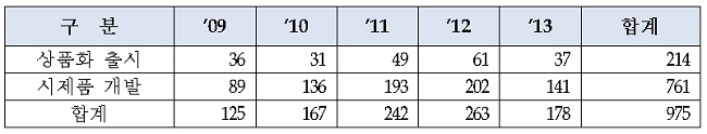 ½ÃÁ¦Ç° °³¹ßÀº 2013³âÀ» Á¦¿ÜÇÏ¸é ²ÙÁØÈ÷ Áõ°¡ Ãß¼¼¸¦ º¸¿´´Âµ¥, 2009³â 89°Ç¿¡¼ 2012³â 202°ÇÀ̾ú´Ù°¡ 2013³â 141°ÇÀ¸·Î ÁÙ¾î ÃÑ 761°ÇÀ» ³ªÅ¸³Â´Ù.