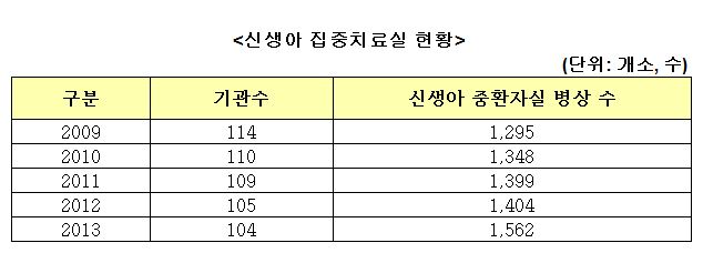 ¾ç ÀÇ¿øÀÌ ½ÉÆò¿øÀ¸·ÎºÎÅÍ Á¦Ãâ¹ÞÀº ¡®½Ãµµº° ½Å»ý¾Æ ÁýÁßÄ¡·á½Ç ÇöȲ¡¯ÀÚ·á¿¡ µû¸£¸é 2011³âºÎÅÍ ÃÖ±Ù 3³â°£ ½Å»ý¾ÆÁýÁßÄ¡·á ÀÇ·á±â°ü ¼ö°¡ ÁÙ¾îµç Áö¿ªÀº 4°÷(±¤ÁÖ, ÃæºÏ, ÀüºÏ, Àü³²), º´»ó¼ö°¡ ÁÙ¾îµç °÷Àº 5°÷(±¤ÁÖ, ÃæºÏ, ÀüºÏ, Àü³², °æºÏ)À¸·Î ³ªÅ¸³µ´Ù.