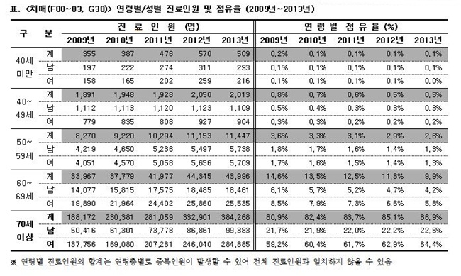 ½ÉÆò¿ø¿¡ µû¸£¸é Áõ°¡ºÐÀÇ ´ëºÎºÐÀº 70´ë ÀÌ»óÀ¸·Î 2009³â 18¸¸8172¸íÀ̾ú´ø Ä¡¸ÅȯÀÚ°¡ 2013³â¿¡´Â 38¸¸4268¸íÀ¸·Î 2¹è°¡·® ´Ã¾úÀ¸¸ç ¿¬·Éº° Á¡À¯À² ¶ÇÇÑ 80.9%¿¡¼ 86.9%·Î ´Ã¾ú´Ù. 60´ëµµ 3¸¸3967¸í¿¡¼ 4¸¸3996¸íÀ¸·Î 5³â°£ 1¸¸¸íÀÌ ´Ã¸ç Àüü ¿¬·ÉÀÇ 9.9%¸¦ Â÷ÁöÇß´Ù.