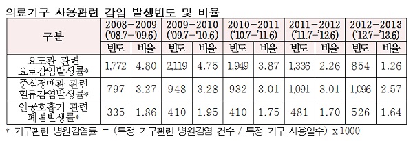ÀÇ·á±â±¸¿¡ ÀÇÇÑ °¨¿°Àº ¿äµµ°ü, Áß½ÉÁ¤¸Æ°ü, ÀΰøÈ£Èí±â µî¿¡ ÀÇÇÑ °ÍÀ¸·Î, 2013³â ±âÁØ Ç÷·ù°¨¿°(ÀÔ¿ø±â°£ 1000ÀÏ´ç 2.57°Ç), Æó·Å(1.64°Ç), ¿ä·Î(1.26°Ç) ¼øÀ̾ú´Ù.