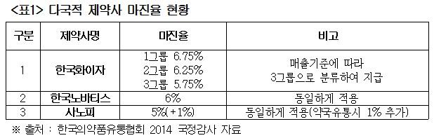 ³²À±Àμø ÀÇ¿øÀº "Çѱ¹ÀǾàǰÀ¯ÅëÇùȸ¿¡ µû¸£¸é µµ¸Å À¯Åë Æò±Õºñ´Â 8.8%Àε¥ ±¹³»»ç ¸¶ÁøÀ²ÀÌ 10~11% Àε¥ ¹ÝÇØ ´Ù±¹Àû»ç ¸¶ÁøÀ²Àº 6~7%¿¡ ±×ÃÄ ¼ÕÀͺбâÁ¡¿¡µµ ¹ÌÄ¡Áö ¸øÇß´Ù"°í ÁöÀûÇß´Ù.