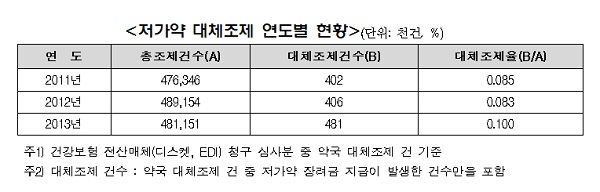 »õ´©¸®´ç ±èÇö¼÷ ÀÇ¿ø(±¹È¸ º¹°Çº¹ÁöÀ§¿øÈ¸)ÀÌ º¸°Çº¹ÁöºÎ·ÎºÎÅÍ Á¦Ãâ¹ÞÀº ¡®Àú°¡¾à ´ëüÁ¶Á¦ ÇöȲ¡¯À» »ìÆìº¸¸é, ´ëüÁ¶Á¦À²ÀÌ 0.1%¿¡ ºÒ°úÇß´Ù. 2013³â ¸» ÇöÀç ÃÑ Á¶Á¦°Ç¼ö 4¾ï8115¸¸°Ç Áß ´ëüÁ¶Á¦ °Ç¼ö´Â 48¸¸°ÇÀÌ´Ù.[Ç¥]