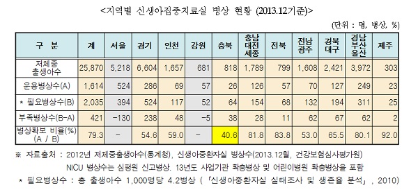 Áö¿ªº° ºÒ±ÕÇüµµ ½É°¢Çؼ ½Å»ý¾ÆÁýÁßÄ¡·á½Ç º´»ó È®º¸ ºñÀ²ÀÌ ÃæºÏ 40.6%·Î °¡Àå ³·¾Ò°í, Àü³²‧±¤ÁÖ(53.0%), °æ±â(54.6%), ÀÎõ(59.0%) ¼øÀ¸·Î º´»ó È®º¸ ºñÀ²ÀÌ ³·¾Ò´Ù.[Ç¥]