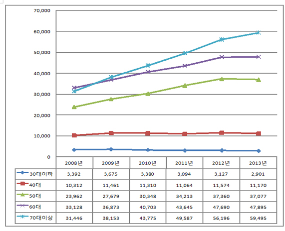 ±¸Ã¼ÀûÀ¸·Î 2008³â 10¸¸2000¸íÀ̾ú´ø ȯÀÚ¼ö´Â 2013³â 15¸¸9000¸íÀ¸·Î ´Ã¾ú´Ù. ƯÈ÷ 60´ë ÀÌ»ó ȯÀÚ¼ö°¡ 68%¸¦ Â÷ÁöÇϸç 50´ë ÀÌ»óÀÇ °í·ÉÃþ¿¡¼ Áõ°¡¼¼°¡ µÎµå·¯Á³´Ù.
