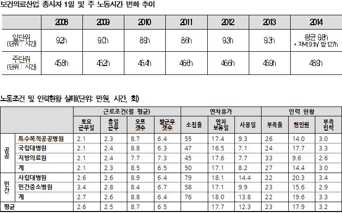 º¸°ÇÀÇ·á³ëÁ¶´Â º´¿ø ³ëµ¿ÀÚÀÇ ÀÏÁÖÀÏ Æò±Õ ±Ù·Î½Ã°£ÀÇ Áõ°¡ Ãß¼¼´Â ¡®º´¿ø ¹× ÀÇ·á±â°üÀÇ Åä¿ä ±Ù¹« È®´ë¡¯, ¡®º´¿øÀÇ ÀÌÀ±Ãß±¸ °æÇ⡯¿¡ µû¸¥ °ÍÀ¸·Î ºÐ¼®Çß´Ù.