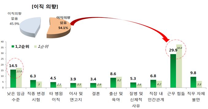 ÀÌ¿¡ µû¶ó ÀÌÁ÷À²µµ ³ôÀº ¸ð½ÀÀÌ´Ù. º¸°ÇÀÇ·á»ê¾÷ Á¾»çÀÚµéÀÇ Æò±Õ ±Ù¼Ó³â¼ö´Â 9.5³âÀ¸·Î, 10³âÀÌ ³Ñ´Â ³ëµ¿ÀÚ´Â 40.4%·Î ³ªÅ¸³µ´Ù. ¶Ç Á¶»ç ´ë»ó 54.1%°¡ ÀÌÁ÷À» °í¹ÎÇϰí ÀÖ´Â °ÍÀ¸·Î ³ªÅ¸³µ´Ù.