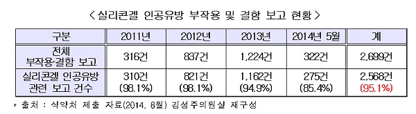ÃßÀû°ü¸®´ë»ó ÀÇ·á±â±âÀÇ ¿¬µµº° ºÎÀÛ¿ë º¸°í ÇöȲÀ» º¸¸é, ¾ÐµµÀûÀÎ 1À§´Â ½Ç¸®ÄÜ°Ö ÀΰøÀ¯¹æÀ¸·Î¼, ÃÖ±Ù 4³â°£ Á¢¼öµÈ 2699°ÇÀÇ ºÎÀÛ¿ë º¸°í Áß 2568°Ç(95.1%)ÀÌ ¹ß»ýÇß´Ù.[Ç¥]