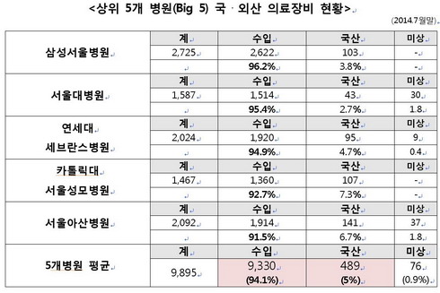 ±¹³» Big5 º´¿øÀ¸·Î ºÒ¸®´Â »ï¼º¼¿ïº´¿ø, ¼¿ï´ëº´¿ø, ¿¬¼¼´ë¼¼ºê¶õ½ºº´¿ø, °¡Å縯´ë¼¿ï¼º¸ðº´¿ø, ¼¿ï¾Æ»êº´¿ø(¿Ü»ê º¸À¯À² ¼ø)ÀÇ ±¹»ê ÀÇ·á±â±â »ç¿ë ÇöȲÀº Æò±Õ 5%¿¡ ±×ÃÆ´Ù.