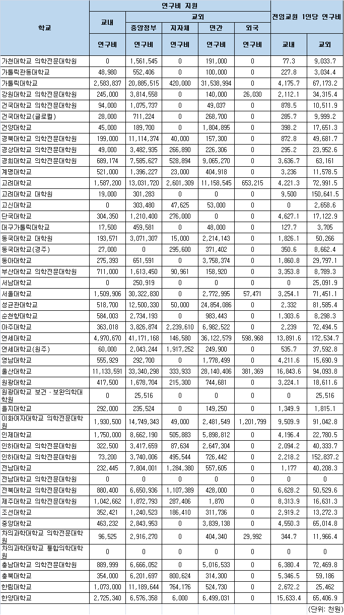 Áö³ÇØ ±¹³» Àǰú´ëÇÐ °¡¿îµ¥ ¿¬±¸ºñ¸¦ °¡Àå ¸¹ÀÌ °ÅµÐ °÷Àº ¿¬¼¼ÀÇ´ë·Î Á¶»çµÆ´Ù. '±³³» ¿¬±¸ºñ'´Â ¿ï»ê´ë Àǰú´ëÇÐÀÌ ¾ÐµµÀûÀ¸·Î ¸¹¾Ò´Ù.