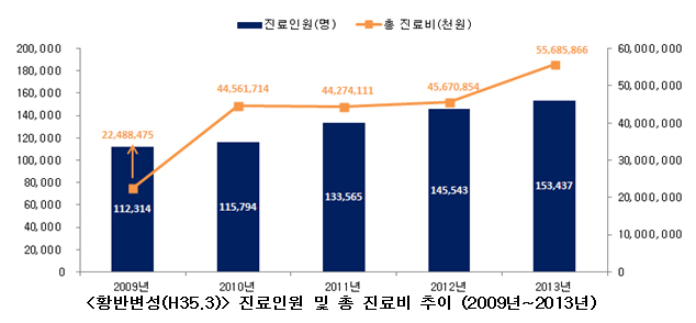 °Ç°º¸Çè½É»çÆò°¡¿ø(¿øÀå ¼Õ¸í¼¼)Àº 2009³âºÎÅÍ 2013³â±îÁöÀÇ 'Ȳ¹Ýº¯¼º(H35.3, Ȳ¹Ý ¹× ÈıغÎÀÇ º¯¼º)'¿¡ ´ëÇÑ °Ç°º¸Çè ¹× ÀÇ·á±Þ¿© ½É»ç°áÁ¤ ÀڷḦ ºÐ¼®Çß´Ù.