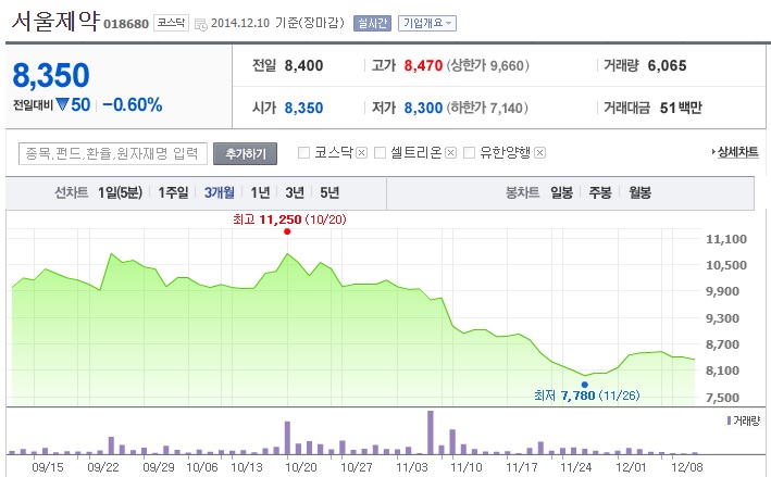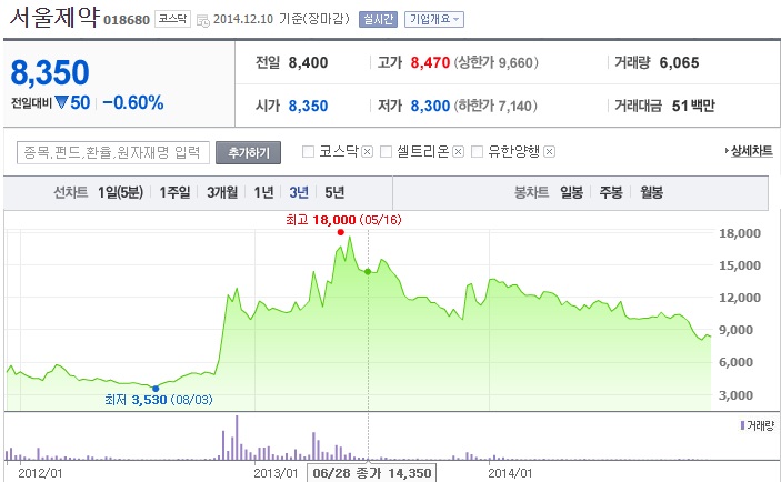 °á±¹ Áö³ÇØ 5¿ù 1¸¸8000¿ø±îÁö ±â·ÏÇß´ø ¼¿ïÁ¦¾àÀÇ ÁÖ°¡´Â ¾à 1³â 7°³¿ùÀÌ Áö³ ÇöÀç(12¿ù 10ÀÏ) 8350¿øÀÇ Á¾°¡·Î ÀåÀ» ¸¶ÃÆ´Ù. 1³â¿© ¸¸¿¡ 50% ÀÌ»ó ÁÖ°¡°¡ Ç϶ôÇÏ¸ç ¹ÝÅ丷 ³µ´Ù.[±×·¡ÇÁ ß¾]