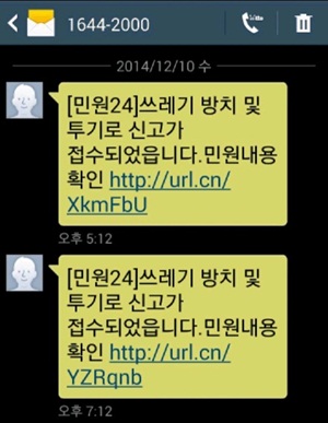 ½º¹Ì½Ì ÀÏ´çÀº "¾²·¹±â ¹æÄ¡ ¹× Åõ±â·Î ½Å°í°¡ Á¢¼ö µÇ¾ú½À´Ï´Ù. ¹Î¿ø³»¿ëÈ®ÀÎ http://..."¶ó¸ç 2½Ã°£ ´ÜÀ§·Î ÀÎÅÍ³Ý ÁÖ¼Ò¸¦ º¯°æÇØ ¸Þ½ÃÁö¸¦ º¸³Â´Ù.