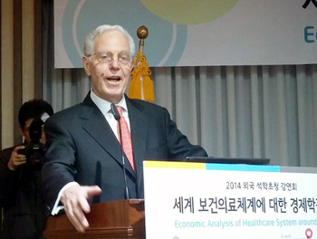 '¼¼°è º¸°ÇÀÇ·áü°è¿¡ ´ëÇÑ °æÁ¦ÇÐÀû ºÐ¼®'À» ÁÖÁ¦·Î ¿¬´Ü¿¡ ¼± ±×´Â "¹Ì±¹ÀÇ ÀÇ·á½Ã½ºÅÛÀº ÈǸ¢ÇÏÁö¸¸ º¸°ÇÀÇ·áÁ¦µµ´Â Àý´ë ¹è¿ì°Å³ª µû¶ó ÇØ¼± ¾È µÈ´Ù"¸é¼ ¹Ì±¹, ´ë¸¸, µ¶ÀÏ, ¿µ±¹ µî ¼¼°è °¢±¹ÀÇ Á¦µµ¸¦ ºñ±³Çß´Ù.