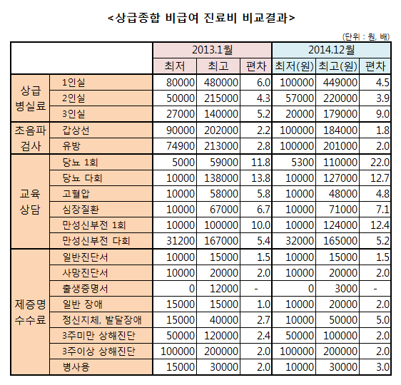 ºñ±³¿¡´Â Á÷Á¢ ºñ±³°¡ °¡´ÉÇÑ »ó±Þº´½Ç·á, °©»ó¼± ¹× À¯¹æ ÃÊÀ½ÆÄ°Ë»ç, ±³À°»ó´ãºñ, Á¦Áõ¸í¼ö¼ö·á ÃÑ 19°³ Ç׸ñÀÌ Æ÷ÇԵƴÙ. 2013³â °ø°³Ç׸ñÀ̾ú´ø PETÃÔ¿µºñ¿Í ĸ½¶³»½Ã°æÀº ±Þ¿©·Î ÀüȯµÅ Á¦¿ÜµÆ´Ù.