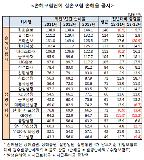 ½ÉÁö¾î °°Àº Ç¥ÁØÈµÈ ½Ç¼Õº¸ÇèÀ» ÆÇ¸ÅÇϰí ÀÖ´Â »ý¸íº¸Çè»çµéÀÇ ¼ÕÇØÀ²Àº 2013³â ¸» ±âÁØ 100%¸¦ ³Ñ´Â °÷ÀÌ ÇÑ °÷µµ ¾ø¾ú°í, º¸Çè»çº°·Î ¼ÕÇØÀ²ÀÌ ¶³¾îÁö´Â °÷µµ ÀÖ¾ú´Ù.