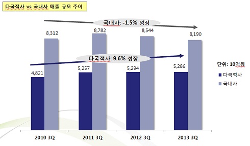 ´õ¿íÀÌ ±¹³» Á¦¾à»ê¾÷Àº »õ·Î¿î ¼ºÀå ȯ°æÀ» ÇÊ¿ä·Î ÇÏ´Â ½ÃÁ¡¿¡ Á÷¸éÇß´Ù. ±¹³»¿¡ ÁøÃâÇÑ ´Ù±¹Àû»ç°¡ Áö³ 2010³âºÎÅÍ ¿¬Æò±Õ 9.6%ÀÇ ¼ºÀåÀ» À̾î¿Âµ¥ ºñÇØ ±¹³»»ç´Â ¸Å³â -1.5% ¼ºÀåÇϸç ÇÏÇâ¼¼¸¦ ¹þ¾î³ªÁö ¸øÇϰí Àֱ⠶§¹®ÀÌ´Ù.