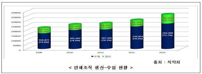 °í·ÉÈ ¹× ÀÇ·á±â¼ú ¹ß´Þ¿¡ µû¶ó ÀÎüÁ¶Á÷ ¼ö¿ä°¡ ¸Å³â Áõ°¡Çϰí ÀÖÁö¸¸ ±¹³» ±âÁõÀÌ È°¼ºÈ µÅ ÀÖÁö ¾Ê¾Æ 70% ÀÌ»óÀ» ¼öÀÔ¿¡ ÀÇÁ¸Çϰí ÀÖ´Â ½ÇÁ¤ÀÌ´Ù.