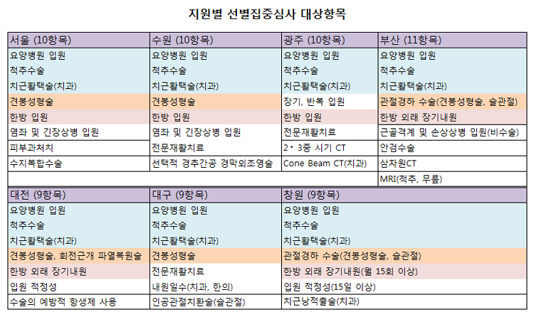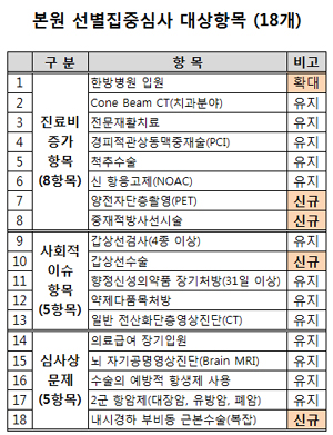 ÀÏ´Ü ´ëºÎºÐÀÇ Áö¿ø¿¡¼´Â Áø·áºñ Áõ°¡¸¦ ÀÌÀ¯·Î ¡ã¿ä¾çº´¿ø ¹× ÇÑÀÇ¿øÀÇ ÀÔ¿ø ȤÀº ¿Ü·¡ ¡ãÄ¡°úÀÇ Ä¡±ÙȰÅüú ¡ãôÃß¼ö¼ú ¡ã°ßºÀ¼ºÇü¼úÀÇ ±Þ¿©±âÁØ Áؼö¿©ºÎ¸¦ ÁýÁ߽ɻçÇ׸ñÀ¸·Î ¼±Á¤Çß´Ù.